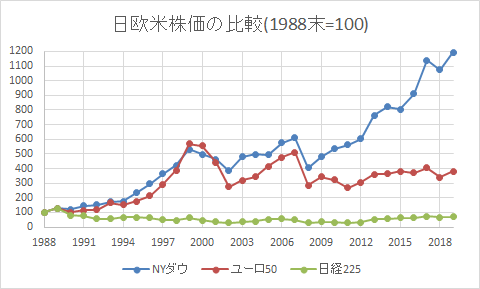 1988年末日=100としてプロットしたものです。