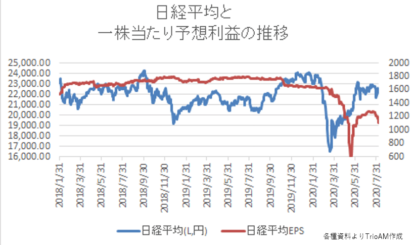ここ2年間の日経平均と、一株当たりの