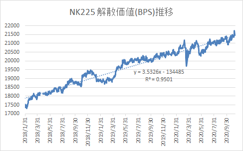 日経平均解散価値 = 3.5326x-134485 ・・・・ (1)