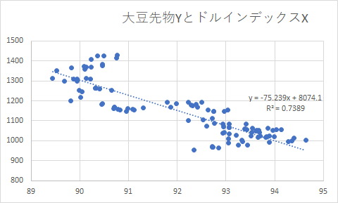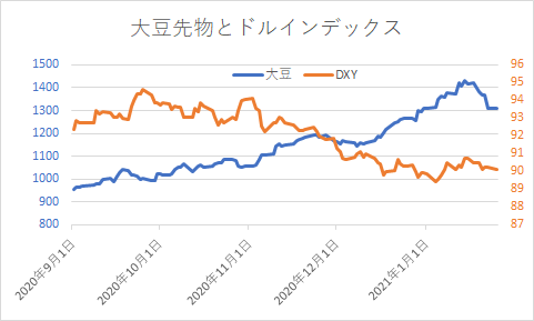 この期間の大豆とドルの関係を、