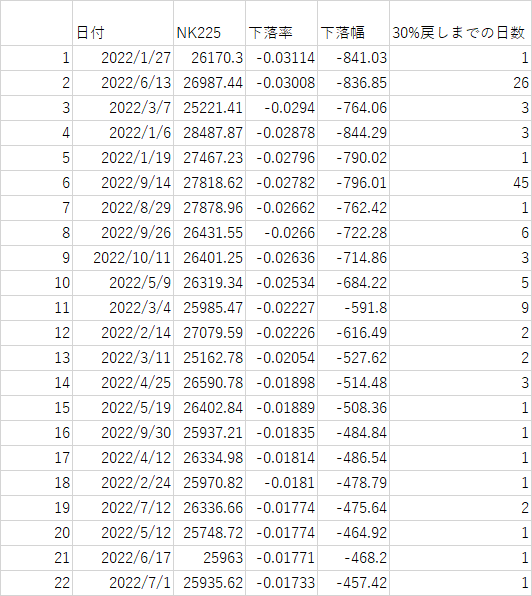 (1日で30%戻しを終える事象が50%の確率で発生している)