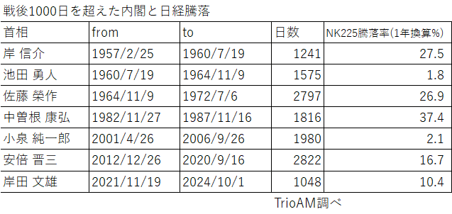 1000日を超えた内閣をピックし、
